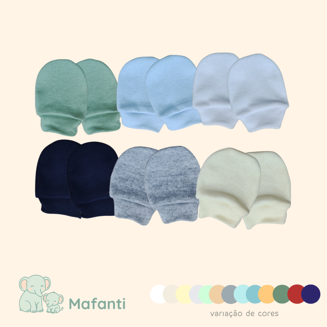 O kit é composto por 3 pares de luvas em cores variadas, trazendo versatilidade e praticidade para o enxoval.